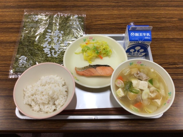 今日のメニューは、セルフおにぎり、焼魚(鮭)、浅漬、曲がりねぎ入り豚汁、牛乳です。