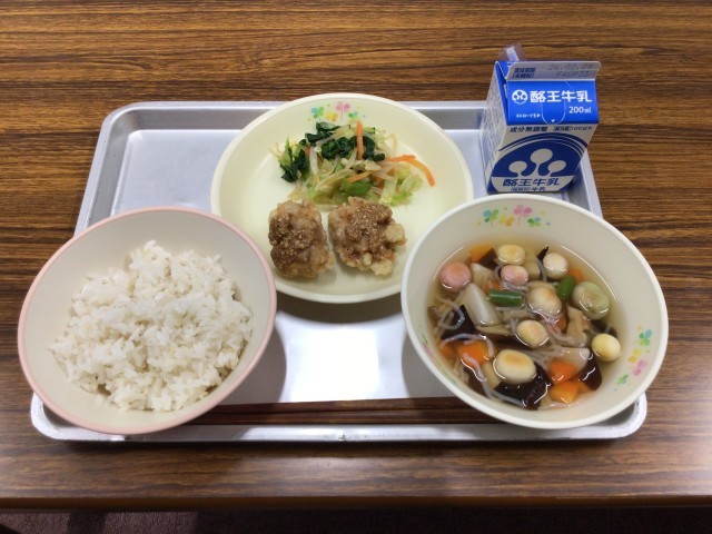 今日のメニューは、麦ごはん、鶏肉のごまみそがけ、こづゆ(会津)、小松菜のからしあえ、牛乳です。