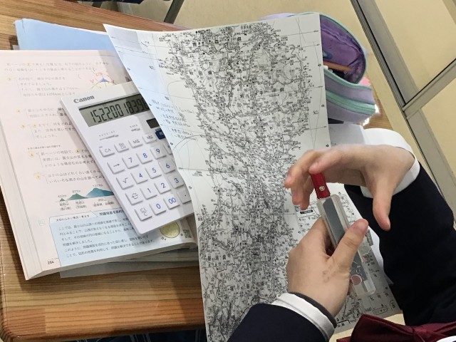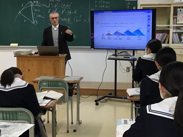 三平方の定理を使って解決します。電卓も利用しながら、およその距離を計算します。 計算結果は・・・152Km! 遮るものがないと、ものすごく遠くまで見渡せるのですね。条件がいいと太平洋まで十分に見えるようです。