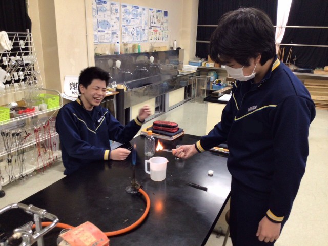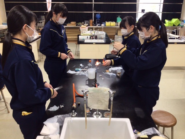 ポリエステル、ポリエチレン、アクリル、・・・などなど、プラスチックと一言で言っても、様々な種類のものがあります。プラスチックの特徴などを学んでいますが、熱に弱いというのも大きな特徴の一つです。ガスバーナーであぶって燃やした時の様子を観察しています。ペットボトル本体やキャップ、コンビニのレジ袋、消しゴムなども燃やして確かめています。