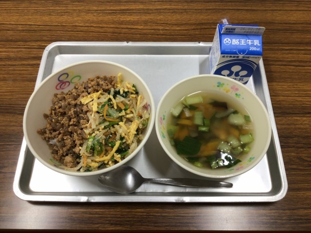 今日のメニューは、ビビンバ、五目スープ、牛乳です。
