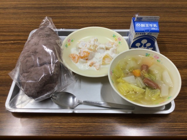 今日のメニューは、ココア揚げパン、ポトフ、フルーツヨーグルトあえ、牛乳です。