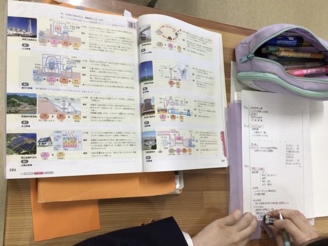 〈カーボンニュートラルの実現に向けた取り組み〉で発電について学んでいます。発電にはたくさんの種類がありますが、基本は、水を沸した水蒸気タービンを回して発電機で発電します。火力も、原子力も、地熱も、バイオマスも水を沸して水蒸気の力でタービンを回します。水力は水の落差で、風力は風でタービンを回します。
