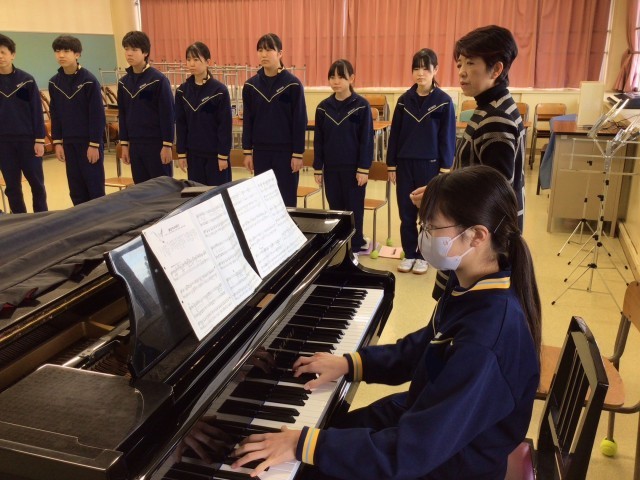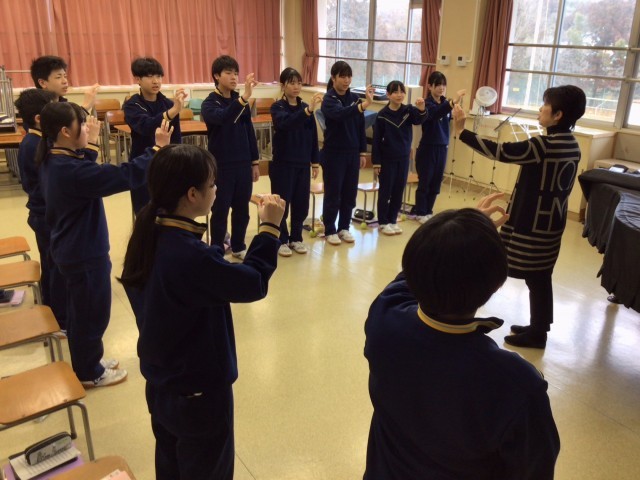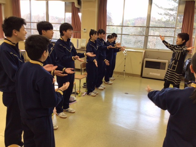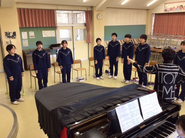 今日は卒業式でよく歌われる「旅立ちの日に」を中心に練習をしました。言葉の意味を考えて息にのせる、そのために体の動きをつけて歌う、すると地声とは全く違った響きになりました。生徒もその違いを実感しているようで、体の動きをつけて歌いたいように見えました。