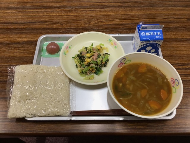 今日のメニューは、カレーうどん、ツナサラダ、ミニいちごゼリー、牛乳です。