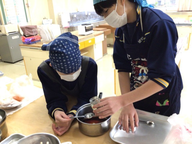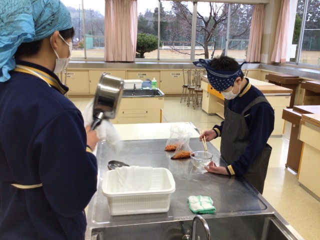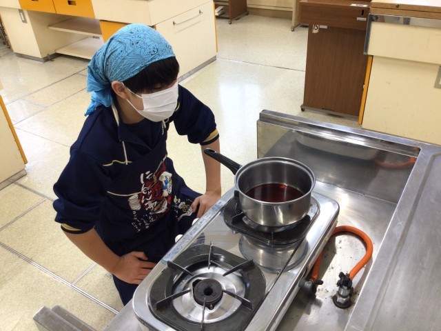 郷土料理作りで「いか人参」の調理実習です。メインは、人参の千切りと調味料づくりですね。人参はマッチ棒の太さに千切りにします。中学1年生でいか人参を作るなんてすごいですよ。私は作ったことがありません。お家でもできそうですね。