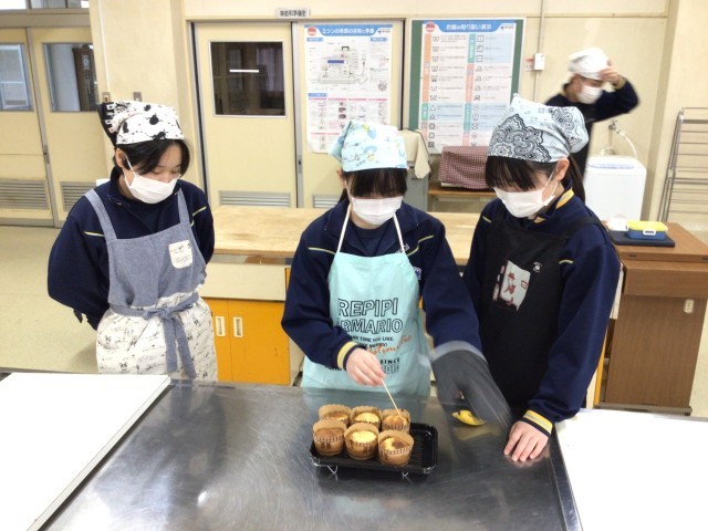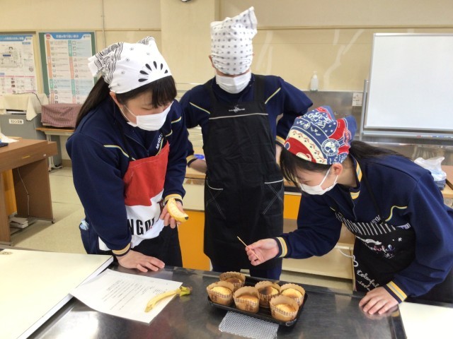 今日は3年生も調理実習でした。最後の家庭科は、幼児のおやつ〈バナナマフィン〉づくり。もう焼きに入っていたので焼き上がりを待つだけでしたが、みんなとっても楽しそう。出来上がりを各自1個タッパーに入れて持ち帰り、残りをみんなで分けて試食していました。とても美味しかったようで、お家で食べるのも楽しみにしていました。