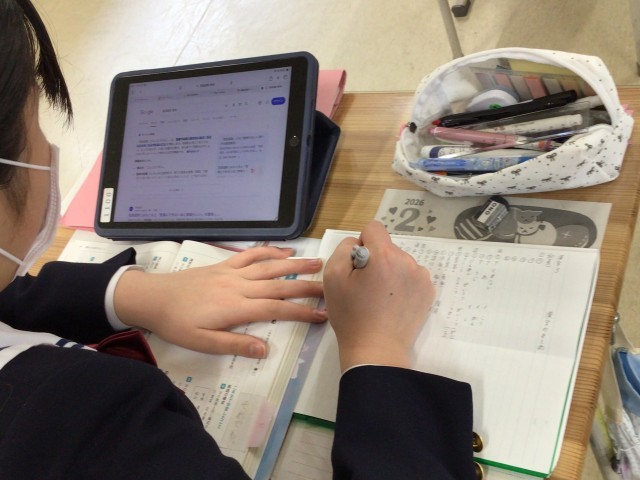 〈漢字のまとめ〉で、教科書の問題にタブレットも活用しながら各自取り組んでいます。