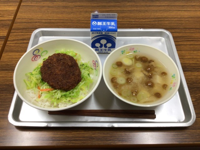 今日のメニューは、ソースカツ丼、なめこ汁、ボイルキャベツ、牛乳です。