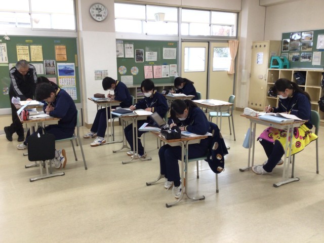 〈3年間の学習のまとめ〉で、関数に取り組んでいました。関数は苦手な人も多くいる単元ですが、高校でも学習しますし、関数が使えると、得なこともたくさんあります。みんな本気で取り組んでいました。みんな、えらいぞ。