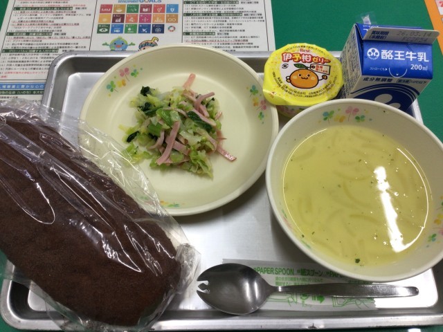 ココア揚げパン、フレンチサラダ,コーンスープ、いよかんゼリー(いい予感♪)、牛乳です。