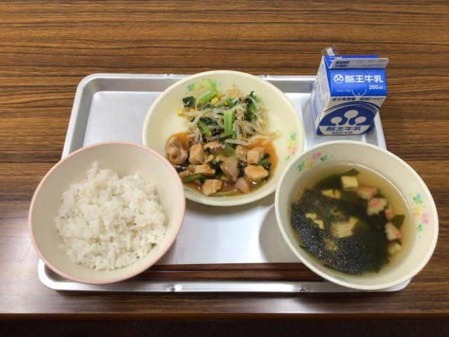 今日のメニューは、麦ごはん、タッチョリム、小松菜のナムル、わかめスープ、牛乳です