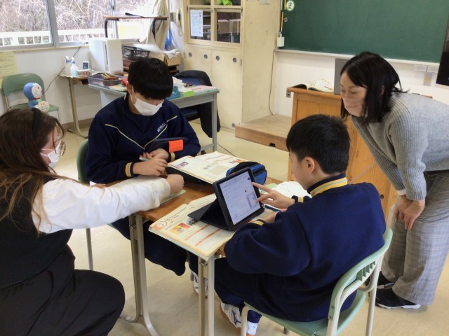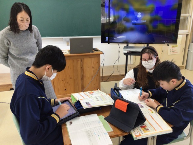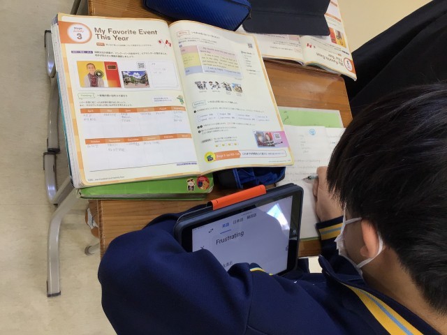 仙台への学習旅行について書いているのかな。“牛タン”という単語も出ていますね。Beef tongueと書くようです。文章がまとまったら読みの練習をして、その後は発表会です。