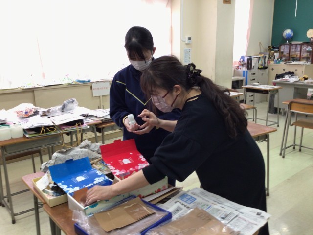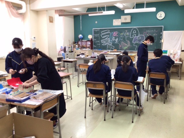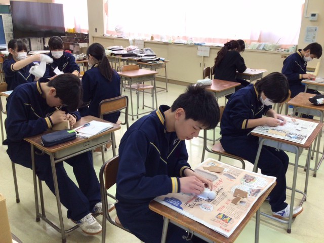 最後の美術です。篆刻を仕上げて、自分だけの印章を完成させます。持ち手を球にするのは無理かなと思ったら、みんな上手に球にしていますね。サンドペーパーの番手を上げて、さらに水をつけてツルツルに仕上げるようです。「いくらでなら売る?」って意地悪く質問したら、「100万円」という答えも。