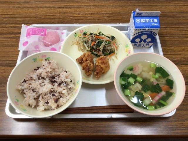 今日のメニューは、赤飯、鶏肉の竜田揚げ、おかかあえ、すまし汁、お祝いデザート、牛乳です。