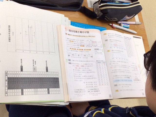 〈四分位数と箱ひげ図〉を学んでいます。これは、昔は扱わなかった内容で、お父さんお母さん世代は習っていないと思います。