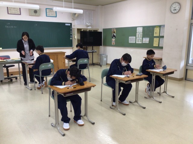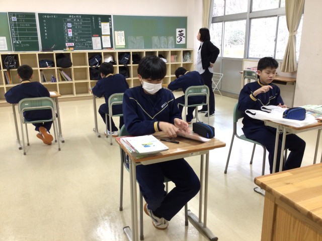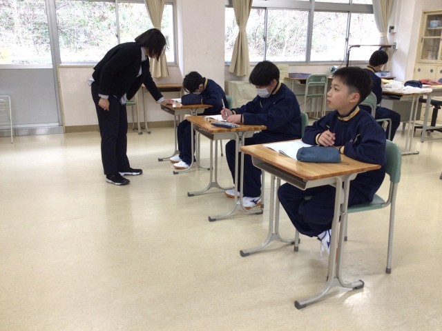今年度から1・2年生は複式学級となりました。学活や総合など合同で行える内容については同じ教室で行います。各教科の授業は、高校入試等も考慮して別教室で単学年で行う計画です。