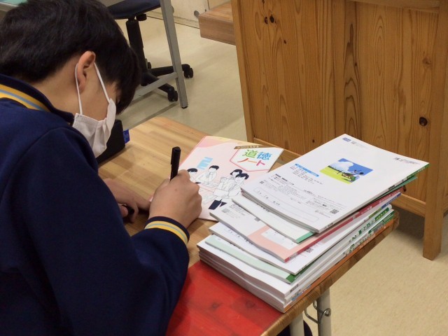 1年生は自分ログの書き方や教科の連絡の仕方など、一日の流れを確認しています。2年生は、購入した教材に記名しているところです。