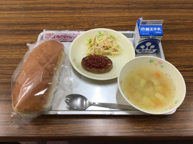 今日のメニューは、コッペパン、いちごジャム、ハンバーグトマトソースがけ、サラスパサラダ、コンソメスープ、牛乳です。