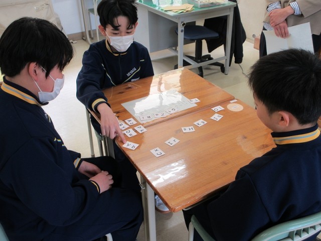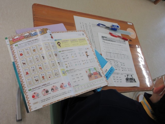 ネイティブの発音を聴き分けてプリントに記入しています。その後は、机の上を片付けて、アルファベットかるたです。さて、誰が一番カードを多く取れるかな?