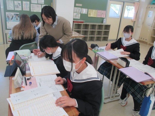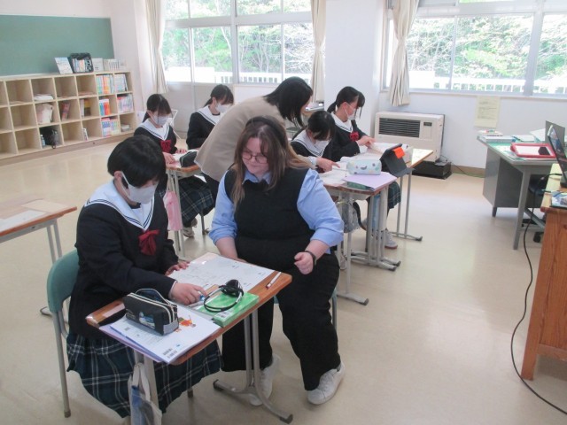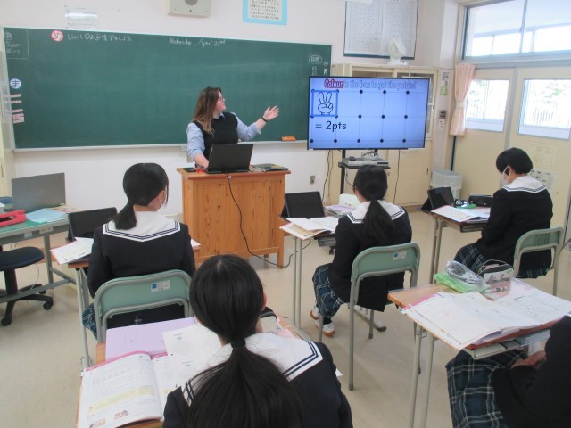 本日4月22日、AETの先生が来校されました。英語の授業では、生徒たちがペアになってさいころを振り、さいころの目に対応した英文を読み上げながら双六を行いました。ゲーム形式の活動を通して、生徒たちはAETの先生とも生きた英語でのコミュニケーションを積極的にとりながら、笑顔で楽しく学習を進めることができました。