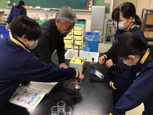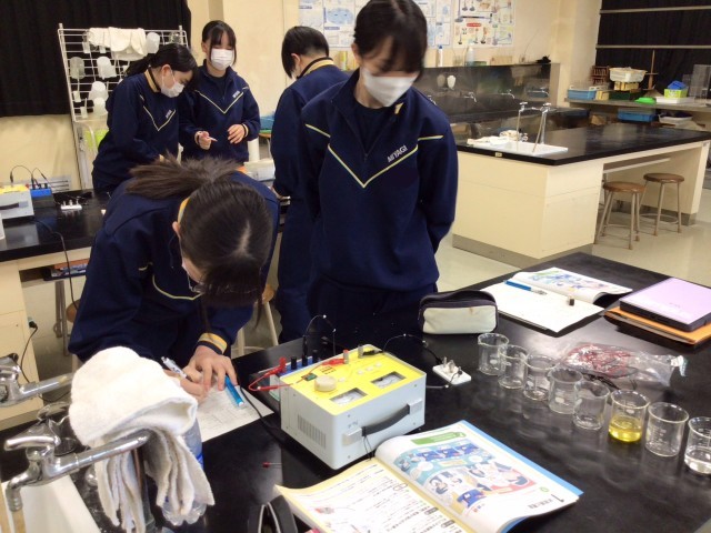 砂糖、レモン汁、食塩、塩酸、エタノール、スポーツドリンク、塩化銅。様々な水溶液に電極を入れ電圧をかけて電気が流れるかを確かめています。