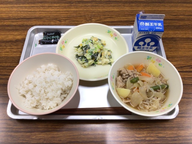 今日のメニューは、麦ごはん、ひじきのり、肉じゃが、みそマヨネーズ和え、牛乳です。