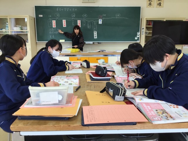 3年生は修学旅行もあったので、今日が最初の家庭科の授業です。自己紹介のあと、授業の進め方、振り返りカードの書き方を確認しました。その後は教科書〈家族・家庭生活〉領域の「私たちの成長と家族・地域」に入りました。