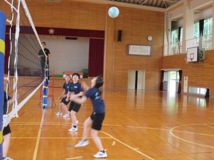 バレーボールの試合。3人チームが優勢のようですねぇ。