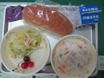 キャベツ、大盛りでも良いですね!自校給食のありがたさ。シチューのジャガイモ、大きくて食べごたえあり!とってもおいしいです!!