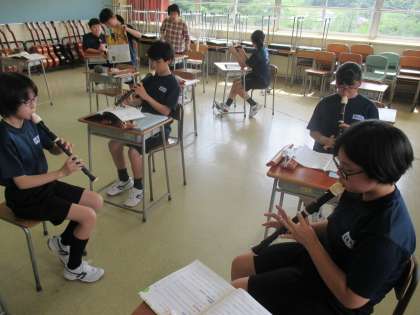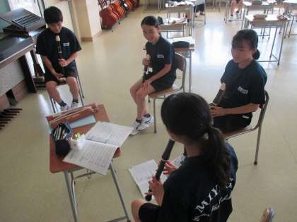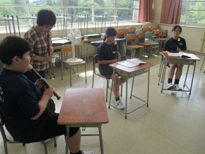アルトリコーダーでアンサンブル。グループに分かれて練習です。
