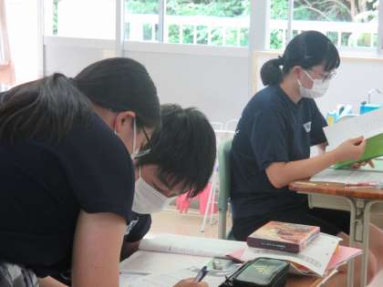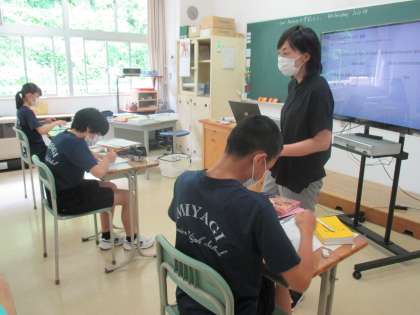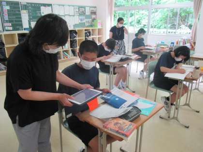 一人一人の英作文をタブレットで撮影しみんなで共有します。誤答もみんなで考えるので作文力が着きますね!