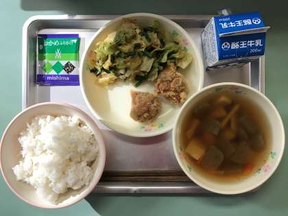 麦ごはん、わかめふりかけ、牛乳、鶏肉のから揚げ、おかかあえ、のっぺい汁です。おいしい給食いつもありがとうございます!