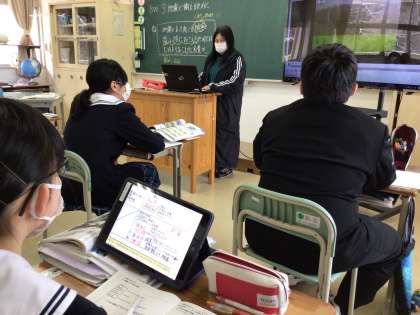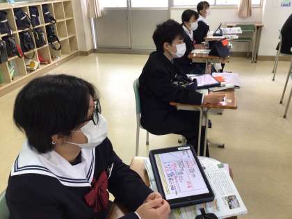 防災教育。地震の被害について資料映像をもとに緊急時の行動を考えました。