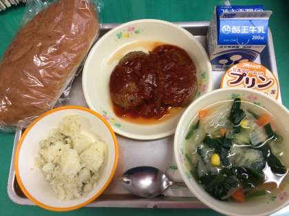 米粉パン、牛乳、ハンバーグトマトソース、粉ふきいも、白菜とコーンのスープ、大豆プリンです。今週は全国学校給食週間となっています。毎日のおいしい給食に感謝ですね。