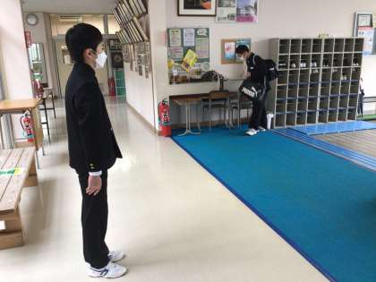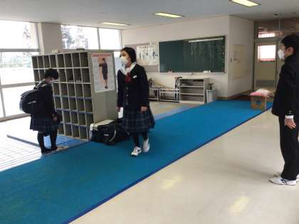 おはようございます。昇降口、気温4度弱。寒さに負けず元気にあいさつ!