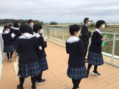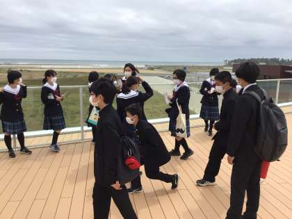 海がすぐ近く。一階だけ骨組みだけが残る建物など震災の痕がいまだに残っています。