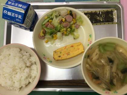 五目厚焼き卵、ウインナーと野菜のソテー、油揚げの味噌汁。いただきます!