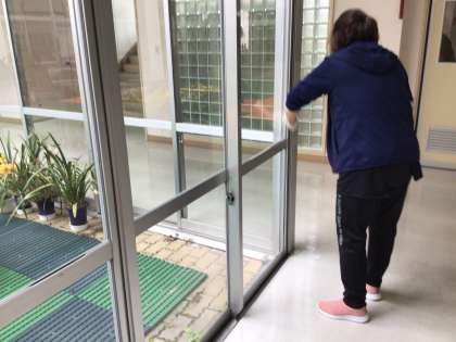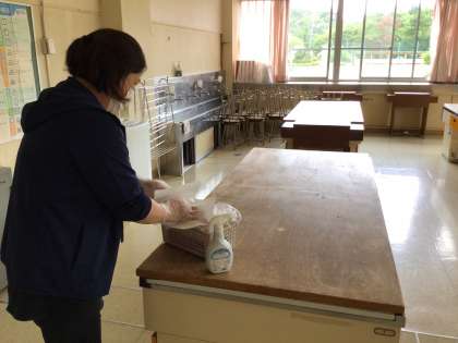 スクールサポートスタッフが丁寧に消毒をしています。安心と安全をありがとう!