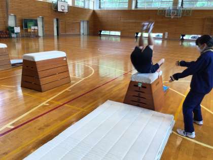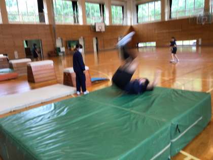 ステップを踏んで練習です。台上前転!