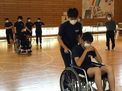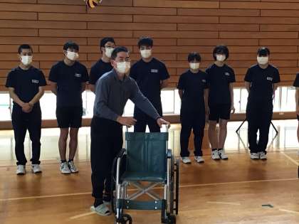 講師を招いて、車イス体験中です。