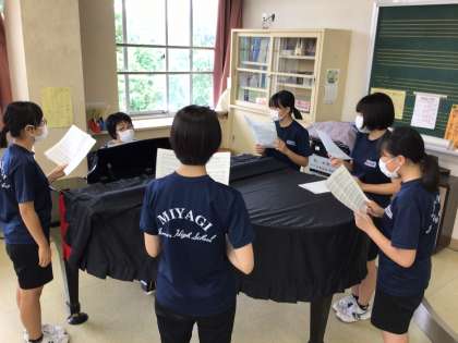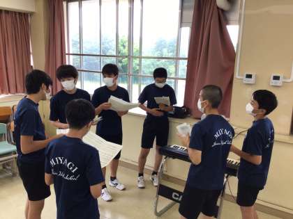 換気をし、感染症対策をしながら合唱練習です。パートに分かれて!