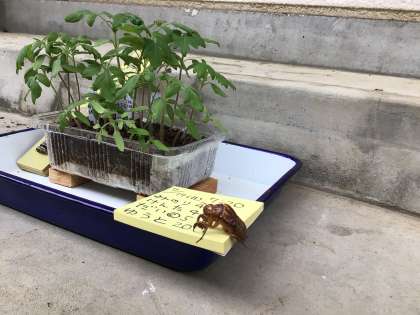 1日でだいぶ伸びた印象があります。セミの抜け殻!誰かが見つけておいてくれたのでしょうね。トマトと一緒に紹介します。朝からセミが鳴いています。