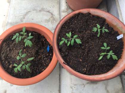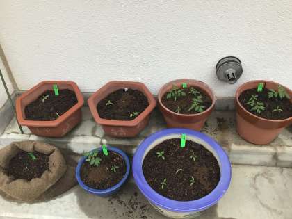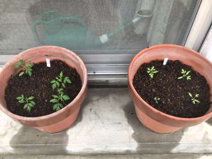 親、子、孫。黄緑色の葉が孫に5株(全20株中)。葉は黄緑と緑が1対3の割合で出ました。実はどうなるかな?ちなみに、親は黄色と赤の実をならせるようです。子は何色に?孫は?楽しみですね!