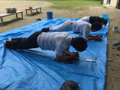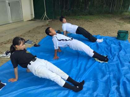 体づくりからじっくり取り組んでいます。顧問の先生も一緒に!オールメンバーです!