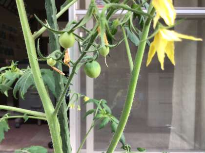緑の葉。親のけんたトマトに似ています。実の形も細長いようですねぇ。