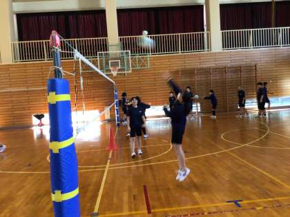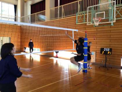 バレー&バスケ!まずはバレーから。ウォーミングアップ中!