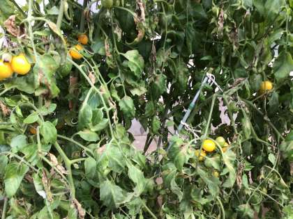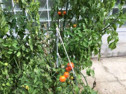 校長研修で1週間不在にしました。久しぶりの記事投稿です。親トマト,黄緑の葉(赤)と緑の葉(黄)。