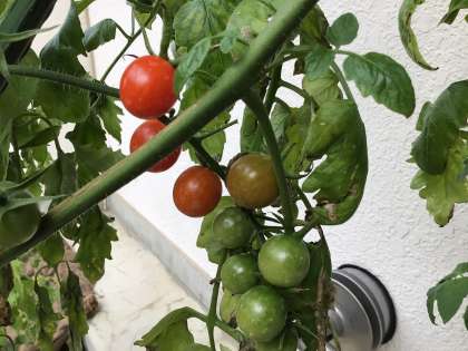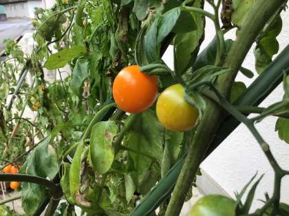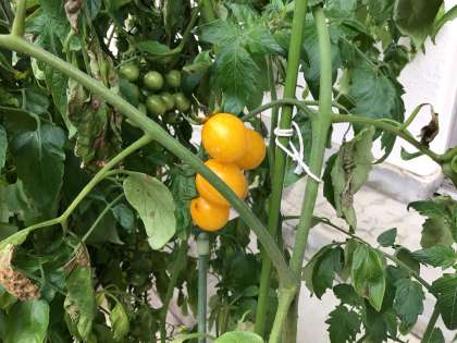 緑の葉に赤,黄色,オレンジの実色出現!葉の色と身の色,独立して遺伝したことがわかります!実験大成功!