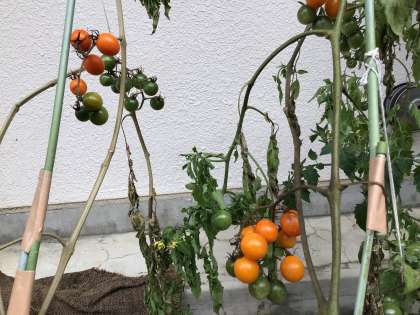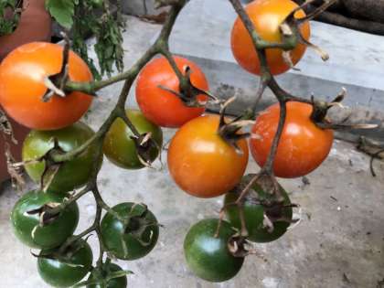 孫世代、黄緑色の葉の実色が赤とオレンジが出現しました。これに黄色が出ればメンデルの遺伝の法則,独立の法則が証明できました。限られた本数でしたので、もっとたくさん栽培していれば黄色が出たのか?黄緑色の葉では黄色が出ないのか?次年度以降に持ち越し研究です。